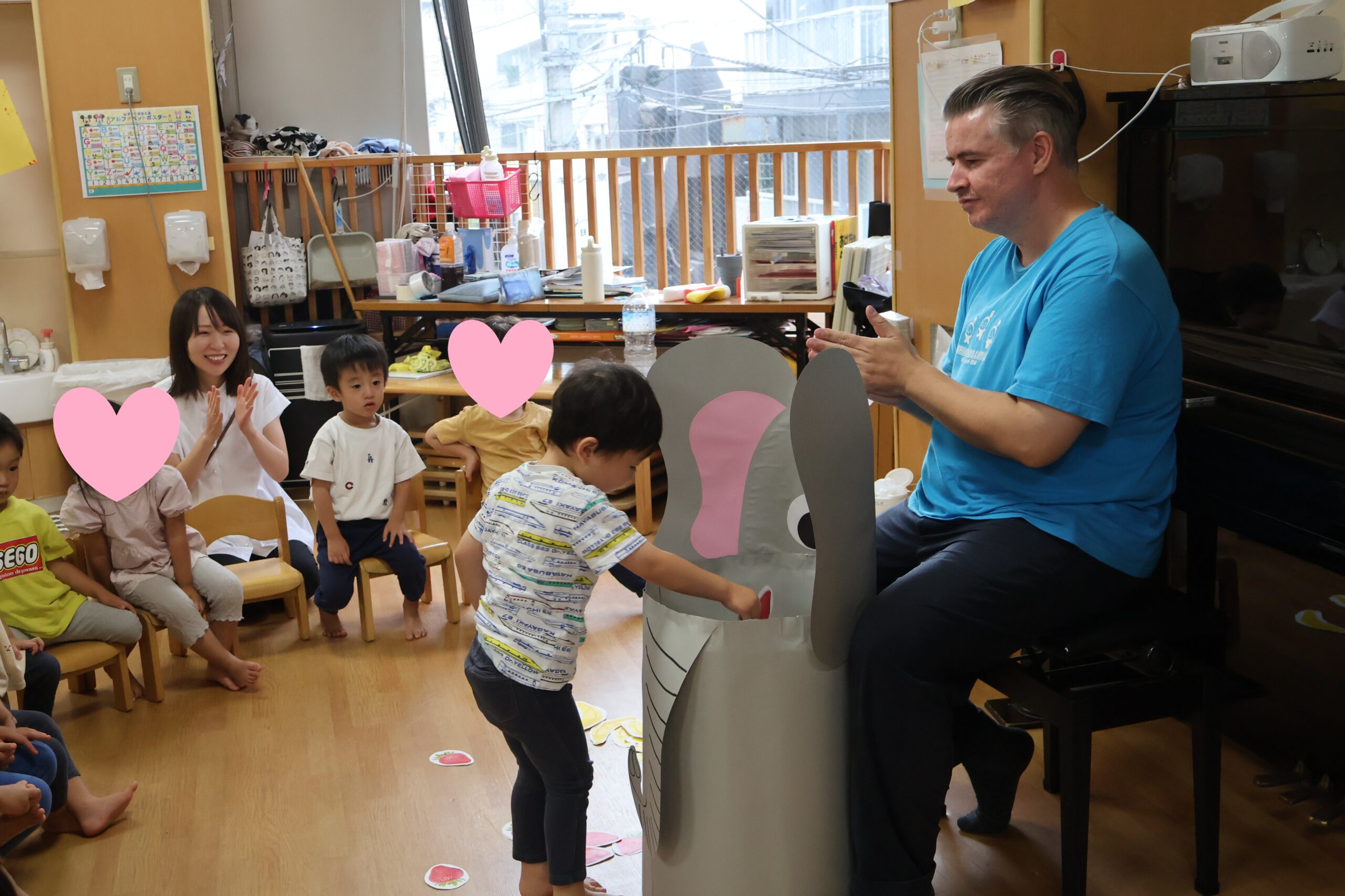 保護者の皆さまにはお部屋の外から様子を見ていただきましたが、子どもたちが元気いっぱいにPETER先生と英語の歌を歌ったり、イラストカードを使ったりして英語に親しんでいる姿をご覧になっていただきました♪