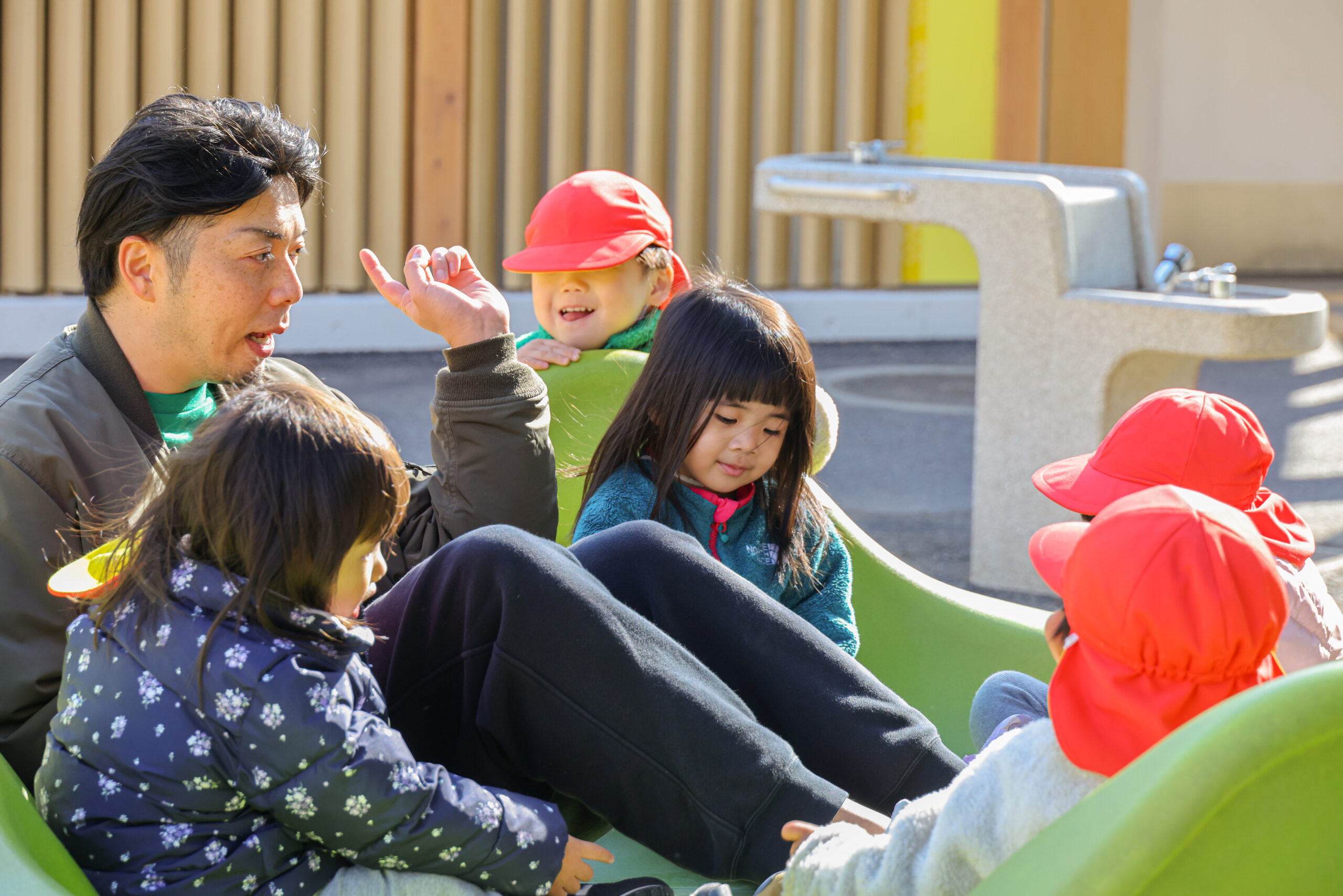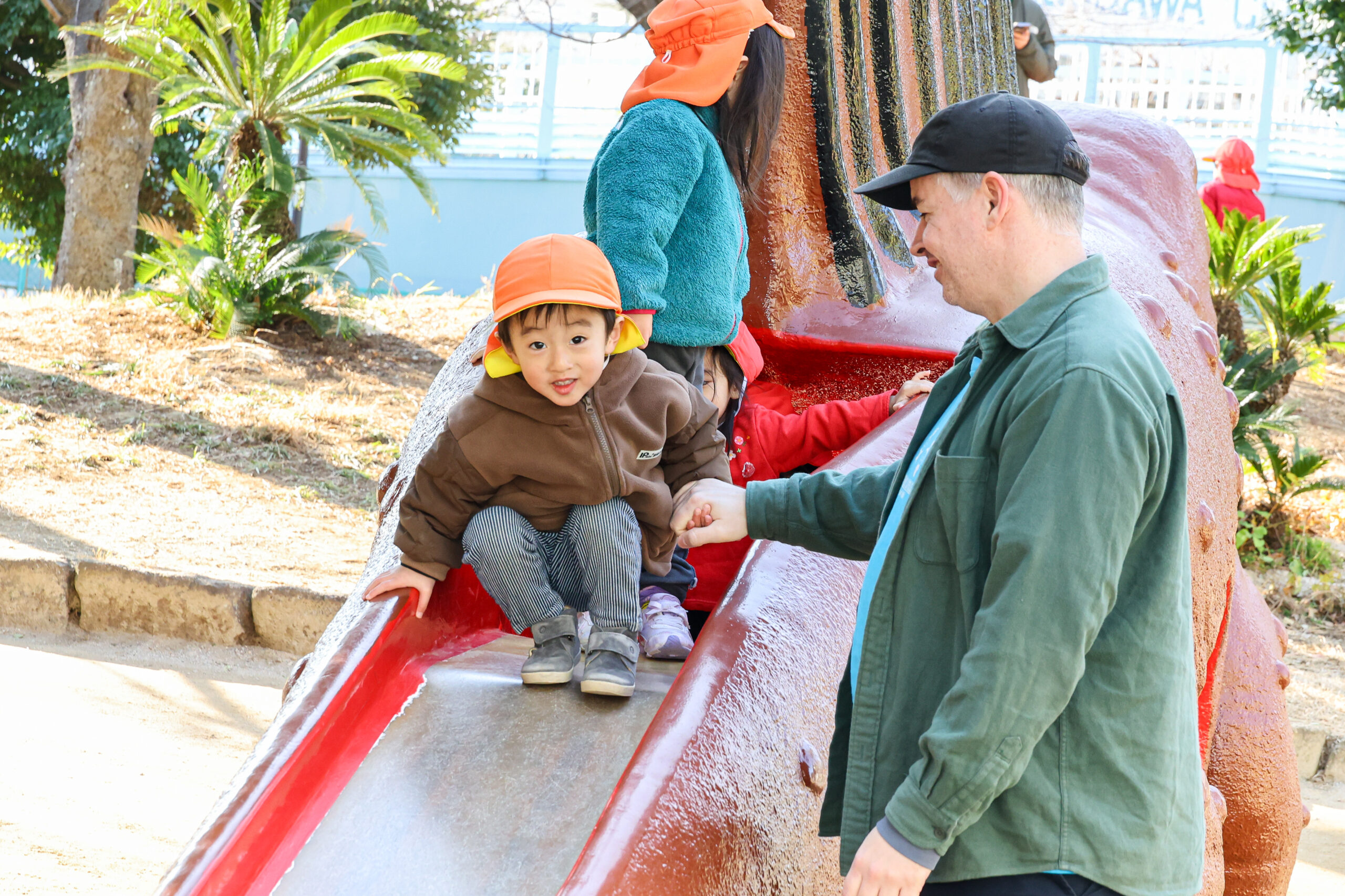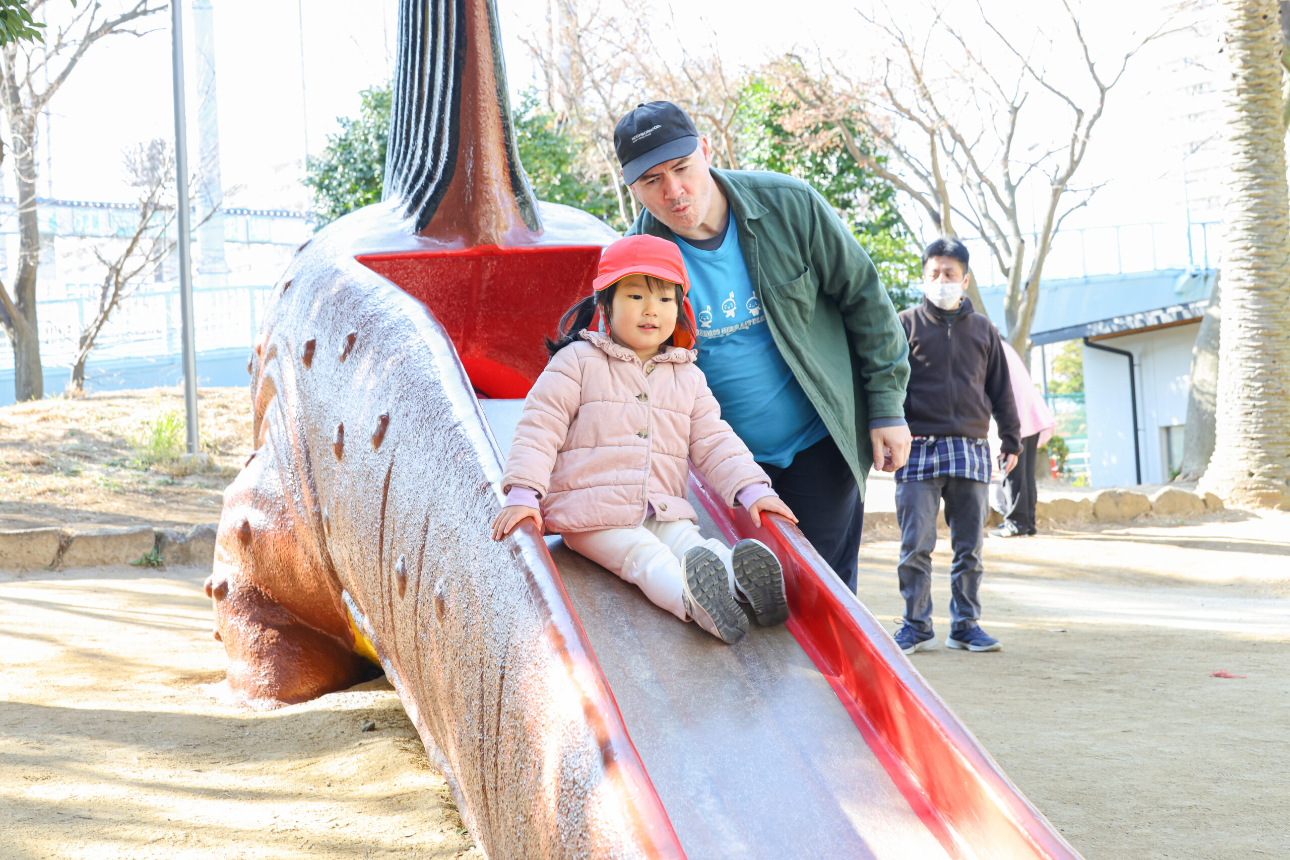 また公園には恐竜をモチーフにしたすべり台がいっぱいあり、子どもたちは大好きな恐竜にウキウキしながら遊びを楽しんでいました♪